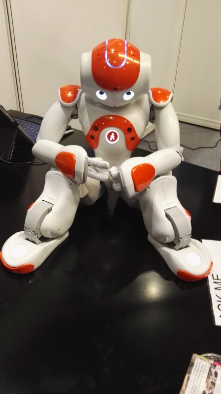 The second stand I visited had a NAO robot and a Pepper robot. Now I am fascinated by emotional robots and how they engage with me and the emotions they engender in me. Both of these robots appear gentle, and I was comfortable around both. Pepper responds to touch, visual and verbal cues. If you stroked Pepper’s head the robot giggled and there were also touch sensors on the arms. If you asked Pepper some pre-selected questions, then Pepper would reply (although struggled to do so if there was too much background noise). Pepper used visual cues and after looking at you for a short time would respond by telling you your age, gender and mood.